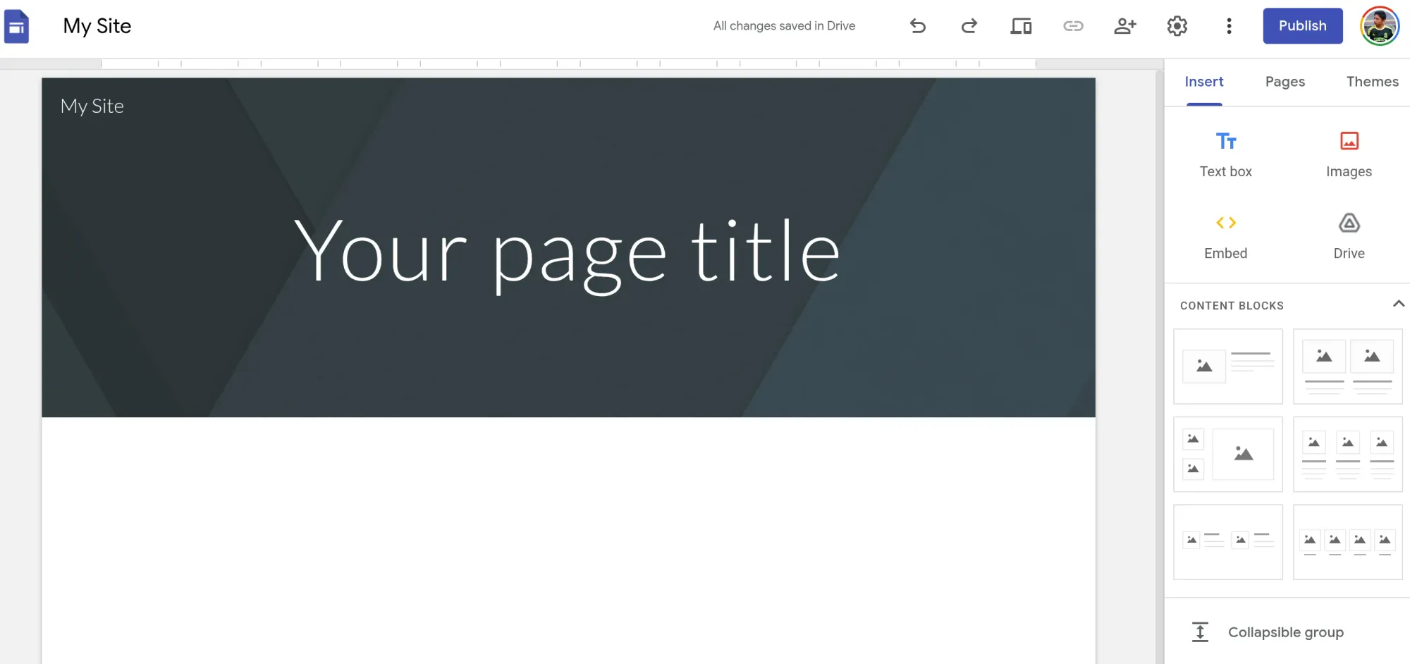 Ini adalah bagian inti dari membuat website Google Sites. Di tab "Insert", Anda punya banyak elemen untuk membangun halaman.